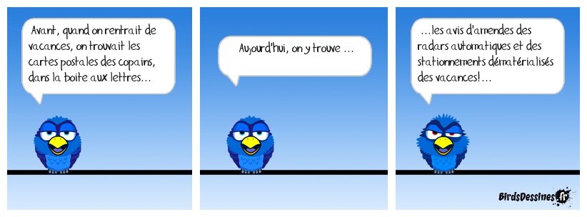 Case 1:Bird 1: Avant, quand on rentrait de vacances, on trouvait les cartes postales des copains, dans la boite aux lettres... | Case 2: Bird 1: Aujourd'hui, on y trouve ... | Case 3: Bird 1: ...les avis d'amendes des radars automatiques et des stationnements dématérialisés des vacances!...