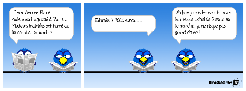 Case 1:Bird 1: Jean-Vincent Placé violemment agressé à Paris... Plusieurs individus ont tenté de lui dérober sa montre..... | Case 2: Bird 1: Estimée à 7000 euros..... | Case 3: Bird 1: Ah ben je suis tranquille, avec la mienne achetée 5 euros sur le marché, je ne risque pas grand chose !