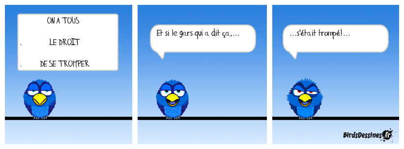 Case 1:Bird 1: ON A TOUS . LE DROIT . DE SE TROMPER | Case 2: Bird 1: Et si le gars qui a dit ça,... | Case 3: Bird 1: ...s'était trompé!...