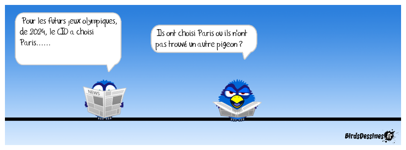 Case 1:Bird 1: Pour les futurs jeux olympiques, de 2024, le CIO a choisi Paris...... | Case 2: Bird 1: Ils ont choisi Paris ou ils n'ont pas trouvé un autre pigeon ? | Case 3: