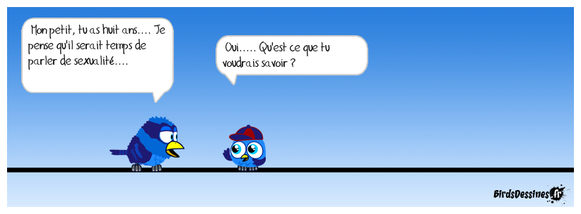 Case 1:Bird 1: Mon petit, tu as huit ans.... Je pense qu'il serait temps de parler de sexualité.... | Case 2: Bird 1: Oui..... Qu'est ce que tu voudrais savoir ? | Case 3: