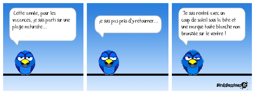 Case 1:Bird 1: Cette année, pour les vacances, je suis parti sur une plage naturiste... | Case 2: Bird 1: je suis pas près d'y retourner... | Case 3: Bird 1: Je suis rentré avec un coup de soleil sous la bite et une marque toute blanche non bronzée sur le ventre !