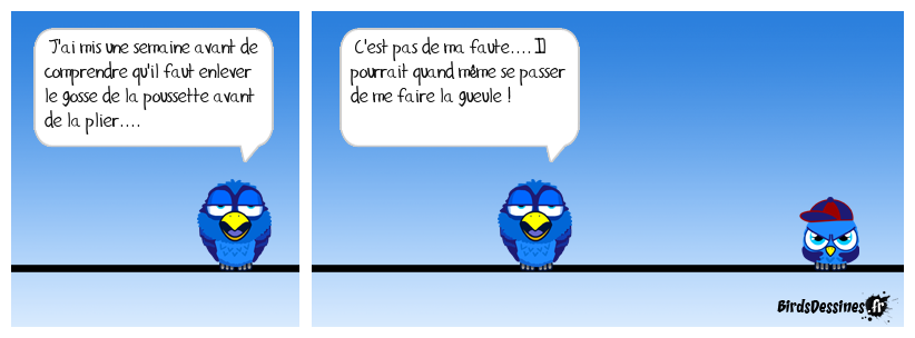Case 1:Bird 1: J'ai mis une semaine avant de comprendre qu'il faut enlever le gosse de la poussette avant de la plier.... | Case 2: Bird 1: C'est pas de ma faute.... Il pourrait quand même se passer de me faire la gueule ! | Case 3: