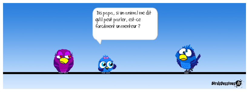 Case 1: | Case 2: Bird 1: Dis papa, si un animal me dit qu'il peut parler, est-ce forcément un menteur ? | Case 3: