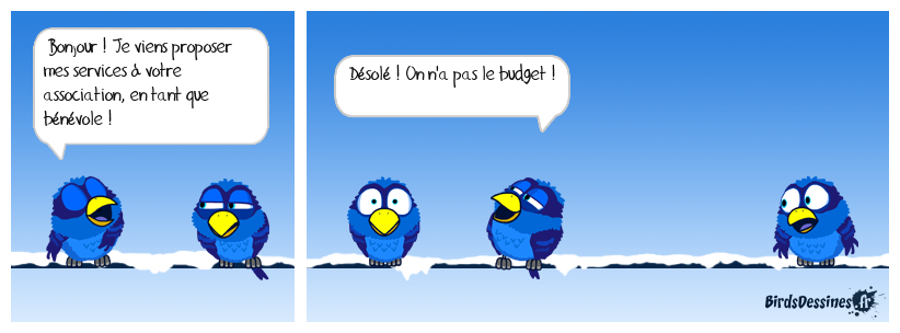 Case 1:Bird 1: Bonjour ! Je viens proposer mes services à votre association, en tant que bénévole ! | Case 2: Bird 1: Désolé ! On n'a pas le budget ! | Case 3:
