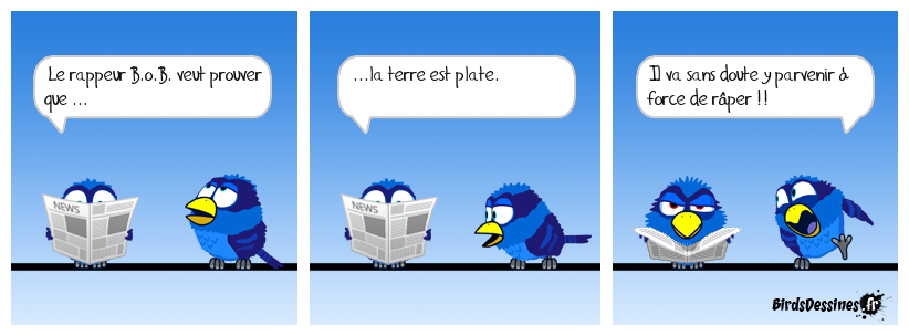 Case 1:Bird 1: Le rappeur B.o.B. veut prouver que ... | Case 2: Bird 1: ...la terre est plate. | Case 3: Bird 1: Il va sans doute y parvenir à force de râper !!