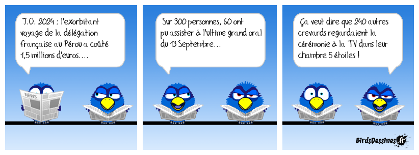 Case 1:Bird 1: J.O. 2024 : l'exorbitant voyage de la délégation française au Pérou a coûté 1,5 millions d'euros.... | Case 2: Bird 1: Sur 300 personnes, 60 ont pu assister à l'ultime grand oral du 13 Septembre... | Case 3: Bird 1: Ça veut dire que 240 autres crevards regardaient la cérémonie à la TV dans leur chambre 5 étoiles !