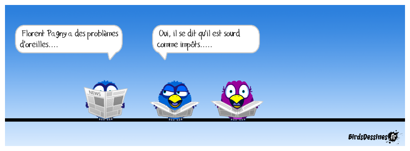 Case 1:Bird 1: Florent Pagny a des problèmes d'oreilles.... | Case 2: Bird 1: Oui, il se dit qu'il est sourd comme impôts..... | Case 3: