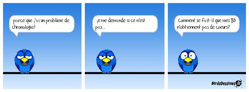 Case 1:Bird 1: parce que j'ai un problème de chronologie! | Case 2: Bird 1: je me demande si ce n'est pas.. | Case 3: Bird 1: Comment se fait-il que mes BD n'obtiennent pas de coeurs?