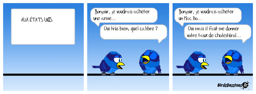 Case 1:Bird 1: AUX ÈTATS UNIS | Case 2: Bird 1: Bonjour, je voudrais acheter une arme... Bird 2: Oui très bien, quel calibre ? | Case 3: Bird 1: Bonjour, je voudrais acheter un Mac Do... Bird 2: Oui mais il faut me donner votre taux de cholestérol...