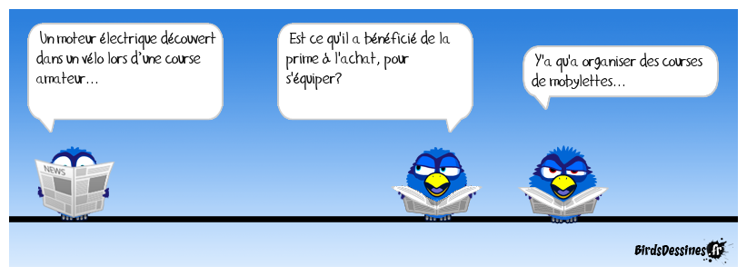 Case 1:Bird 1: Un moteur électrique découvert dans un vélo lors d’une course amateur... | Case 2: Bird 1: Est ce qu'il a bénéficié de la prime à l'achat, pour s'équiper? | Case 3: Bird 1: Y'a qu'a organiser des courses de mobylettes...