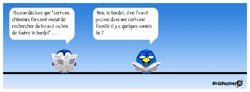Case 1:Bird 1: Macron déclare que "certains chômeurs feraient mieux de rechercher du travail au lieu de foutre le bordel"..... | Case 2: Bird 1: Heu, le bordel, il ne l'avait pas mis dans une certaine famille il y a quelques années lui ? | Case 3: