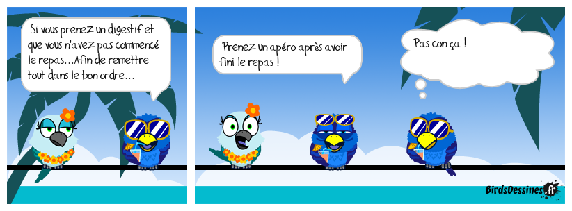 Case 1:Bird 1: Si vous prenez un digestif et que vous n'avez pas commencé le repas...Afin de remettre tout dans le bon ordre... | Case 2: Bird 1: Prenez un apéro après avoir fini le repas ! | Case 3: Bird 1: Pas con ça !