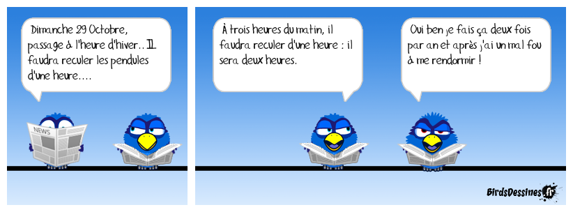 Case 1:Bird 1: Dimanche 29 Octobre, passage à l'heure d'hiver.. IL faudra reculer les pendules d'une heure.... | Case 2: Bird 1: À trois heures du matin, il faudra reculer d'une heure : il sera deux heures. | Case 3: Bird 1: Oui ben je fais ça deux fois par an et après j'ai un mal fou à me rendormir !