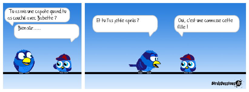 Case 1:Bird 1: Tu as mis une capote quand tu as couché avec Babette ? Bird 2: Bien sûr..... | Case 2: Bird 1: Et tu l'as jetée après ? | Case 3: Bird 1: Oui, c'est une connasse cette fille !