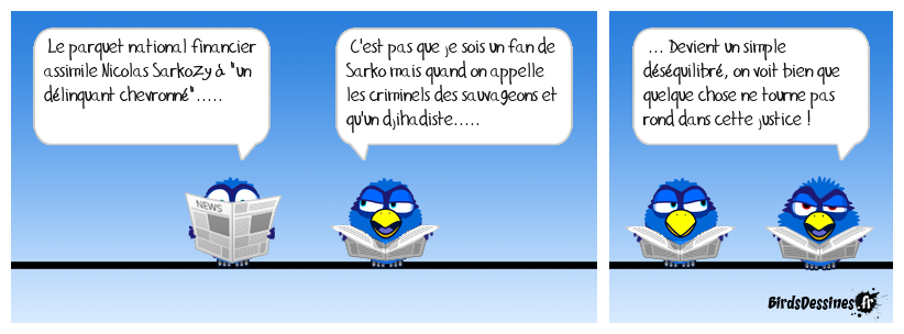 Case 1:Bird 1: Le parquet national financier assimile Nicolas Sarkozy à "un délinquant chevronné"..... | Case 2: Bird 1: C'est pas que je sois un fan de Sarko mais quand on appelle les criminels des sauvageons et qu'un djihadiste..... | Case 3: Bird 1: ... Devient un simple déséquilibré, on voit bien que quelque chose ne tourne pas rond dans cette justice !