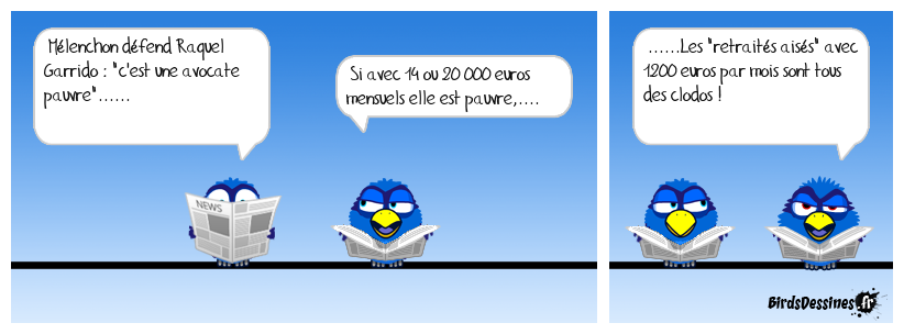 Case 1:Bird 1: Mélenchon défend Raquel Garrido : "c'est une avocate pauvre"...... | Case 2: Bird 1: Si avec 14 ou 20 000 euros mensuels elle est pauvre,.... | Case 3: Bird 1: ......Les "retraités aisés" avec 1200 euros par mois sont tous des clodos !