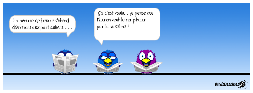Case 1:Bird 1: La pénurie de beurre s'étend désormais aux particuliers...... | Case 2: Bird 1: Ça c'est voulu....je pense que Macron veut le remplacer par la vaseline ! | Case 3: