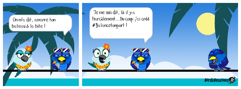 Case 1:Bird 1: On m'a dit, amarre ton bateau à la bite ! | Case 2: Bird 1: Je me suis dit, là il y a harcèlement...Du coup j'ai créé #Balancetonport ! | Case 3: