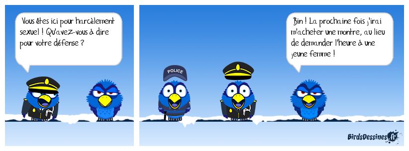 Case 1:Bird 1: Vous êtes ici pour harcèlement sexuel ! Qu'avez-vous à dire pour votre défense ? | Case 2: Bird 1: Bin ! La prochaine fois j'irais m'acheter une montre, au lieu de demander l'heure à une jeune femme ! | Case 3: Bird 1: Bin ! La prochaine fois j'irai m'acheter une montre, au lieu de demander l'heure à une jeune femme !