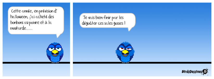 Case 1:Bird 1: Cette année, en prévision d' halloween, j'ai acheté des bonbons au poivre et à la moutarde..... | Case 2: Bird 1: Je vais bien finir par les dégoûter ces sales gosses ! | Case 3: