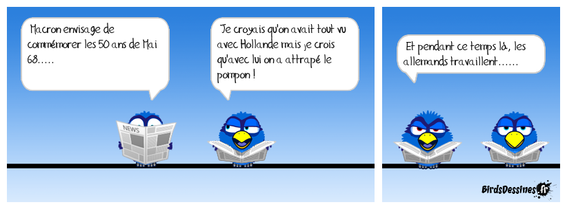 Case 1:Bird 1: Macron envisage de commémorer les 50 ans de Mai 68..... | Case 2: Bird 1: Je croyais qu'on avait tout vu avec Hollande mais je crois qu'avec lui on a attrapé le pompon ! | Case 3: Bird 1: Et pendant ce temps là, les allemands travaillent......