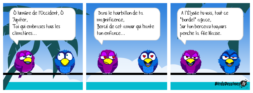 Case 1:Bird 1: Ô lumière de l'Occident, Ô Jupiter, Toi qui embrases tous les climatères... | Case 2: Bird 1: Dans le tourbillon de ta magnificence, Bercé de cet amour qui hante ton enfance... | Case 3: Bird 1: A l’Élysée tu vois, tout ce "bordel" agace, Sur ton berceau toujours penche la fée Niasse.