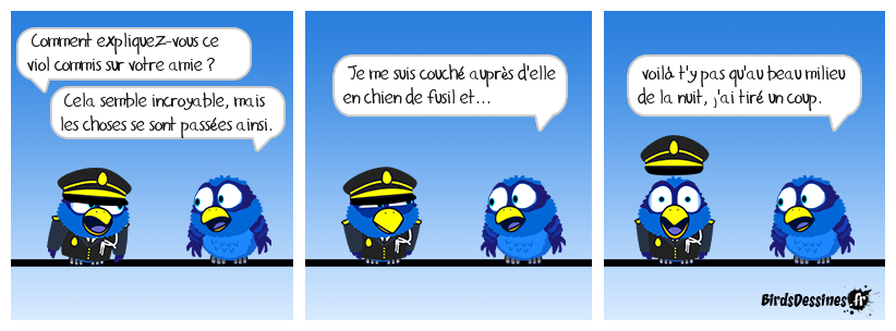 Case 1:Bird 1: Comment expliquez-vous ce viol commis sur votre amie ?Bird 2: Cela semble incroyable, mais les choses se sont passées ainsi. | Case 2: Bird 1: Je me suis couché auprès d'elle en chien de fusil et... | Case 3: Bird 1: voilà t'y pas qu'au beau milieu de la nuit, j'ai tiré un coup.