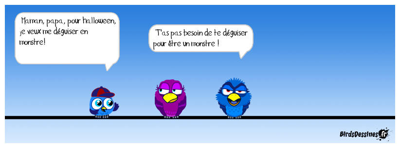 Case 1:Bird 1: Maman, papa, pour halloween, je veux me déguiser en monstre! | Case 2: Bird 1: T'as pas besoin de te déguiser pour être un monstre ! | Case 3: