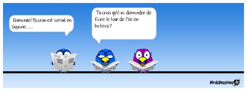 Case 1:Bird 1: Emmanuel Macron est arrivé en Guyane..... | Case 2: Bird 1: Tu crois qu'il va demander de faire le tour de l'île en bateau ? | Case 3: