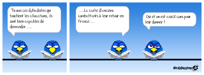 Case 1:Bird 1: Tu vois ces djihadistes qui touchent les allocations, ils sont bien capables de demander..... | Case 2: Bird 1: ....La carte d'anciens combattants à leur retour en France.... | Case 3: Bird 1: Oui et on est assez cons pour leur donner !