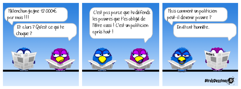 Case 1:Bird 1: Mélenchon gagne 12 000€ par mois !!!Bird 2: Et alors ? Qu'est ce qui te choque ? | Case 2: Bird 1: C'est pas parce que tu défends les pauvres que t'es obligé de l'être aussi ! C'est un politicien après tout ! | Case 3: Bird 1: Mais comment un politicien peut-il devenir pauvre ? Bird 2: En étant honnête.