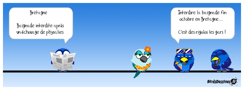 Case 1:Bird 1: Bretagne Baignade interdite après un échouage de physalies | Case 2: | Case 3: Bird 1: Interdire la baignade fin octobre en Bretagne... C'est des rigolos les gars !