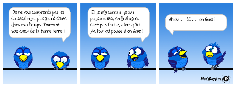 Case 1:Bird 1: Je ne vous comprends pas les Corses,il n'y a pas grand chose dans vos champs. Pourtant, vous avez de la bonne terre ! | Case 2: Bird 1: Et je m'y connais, je suis paysan aussi, en Bretagne. C'est pas facile, alors qu'ici, y'a tout qui pousse si on sème ! | Case 3: Bird 1: Ah oui... SI ... on sème !