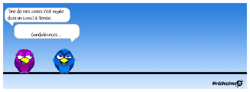 Case 1:Bird 1: Une de mes amies s'est noyée dans un canal à Venise.Bird 2: Gondoléances... | Case 2: | Case 3:
