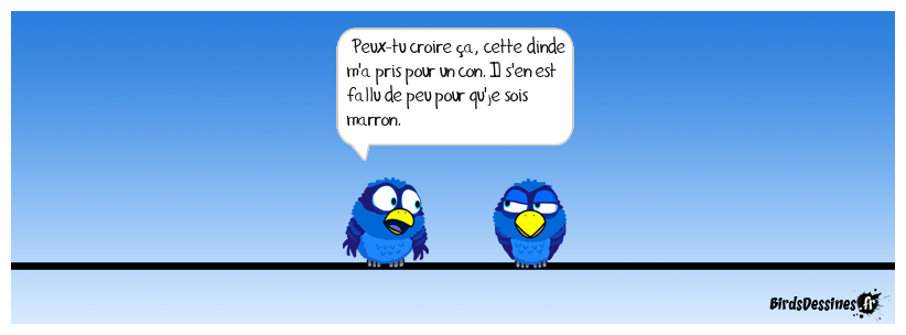 Case 1: | Case 2: Bird 1: Peux-tu croire ça, cette dinde m'a pris pour un con. Il s'en est fallu de peu pour qu'je sois marron. | Case 3: