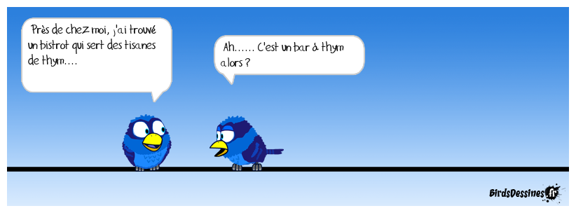Case 1:Bird 1: Près de chez moi, j'ai trouvé un bistrot qui sert des tisanes de thym.... | Case 2: Bird 1: Ah...... C'est un bar à thym alors ? | Case 3: