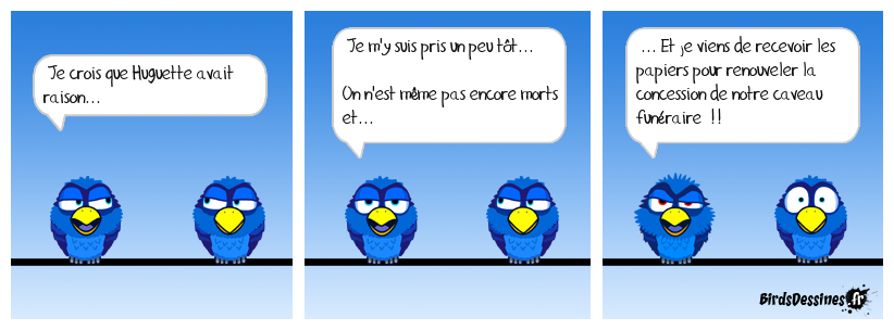 Case 1:Bird 1: Je crois que Huguette avait raison... | Case 2: Bird 1: Je m'y suis pris un peu tôt... On n'est même pas encore morts et... | Case 3: Bird 1: ... Et je viens de recevoir les papiers pour renouveler la concession de notre caveau funéraire !!