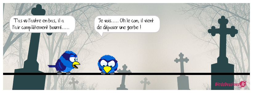 Case 1:Bird 1: T'as vu l'autre en bas, il a l'air complètement bourré..... | Case 2: Bird 1: Je vois..... Oh le con, il vient de déposer une gerbe ! | Case 3: