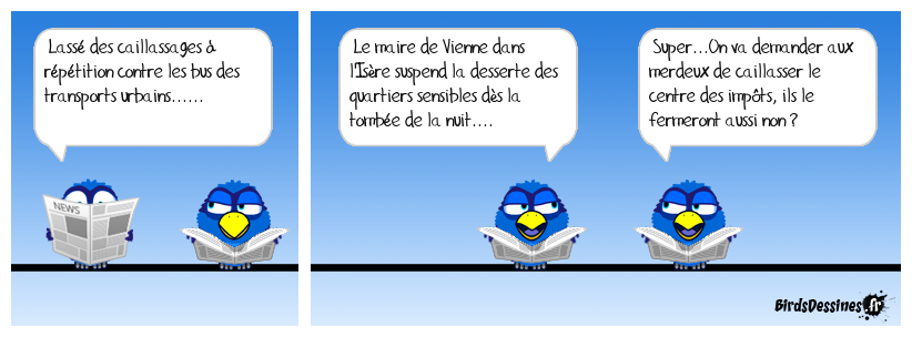 Case 1:Bird 1: Lassé des caillassages à répétition contre les bus des transports urbains...... | Case 2: Bird 1: Le maire de Vienne dans l'Isère suspend la desserte des quartiers sensibles dès la tombée de la nuit.... | Case 3: Bird 1: Super...On va demander aux merdeux de caillasser le centre des impôts, ils le fermeront aussi non ?
