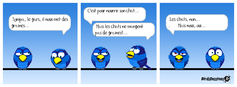 Case 1:Bird 1: Sympa, le gars, il nous met des graines... | Case 2: Bird 1: C'est pour nourrir son chat... Bird 2: Mais les chats ne mangent pas de graines!... | Case 3: Bird 1: Les chats, non... . Mais nous, oui...