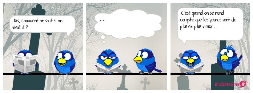 Case 1:Bird 1: Dis, comment on sait si on vieillit ? | Case 2: Bird 1: ... | Case 3: Bird 1: C'est quand on se rend compte que les jeunes sont de plus en plus vieux...