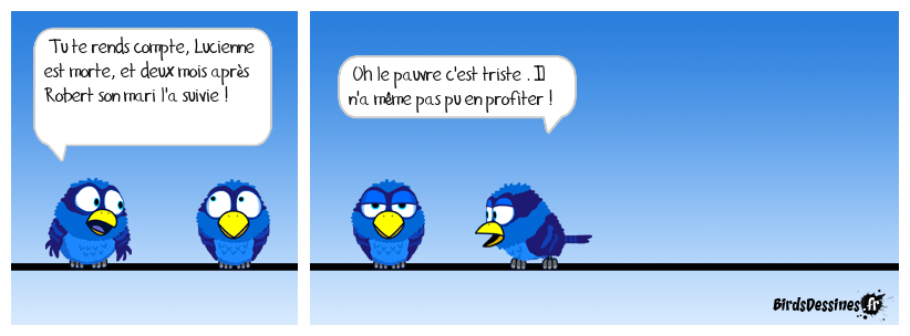 Case 1:Bird 1: Tu te rends compte, Lucienne est morte, et deux mois après Robert son mari l'a suivie ! | Case 2: Bird 1: Oh le pauvre c'est triste . Il n'a même pas pu en profiter ! | Case 3: