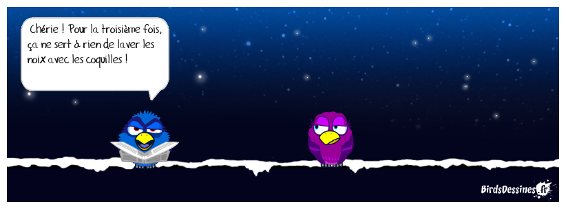 Case 1:Bird 1: Chérie ! Pour la troisième fois, ça ne sert à rien de laver les noix avec les coquilles ! | Case 2: | Case 3: