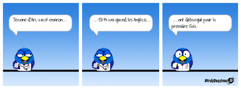 Case 1:Bird 1: Jeanne d'Arc avait environ... | Case 2: Bird 1: ...13/14 ans quand les Anglais... | Case 3: Bird 1: ... ont débarqué pour la première fois.