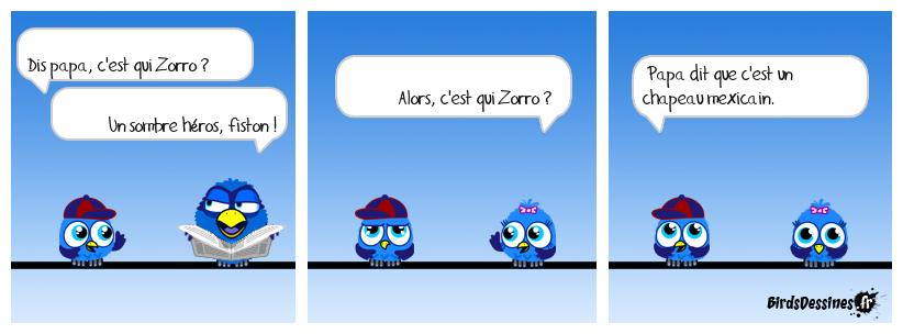 Case 1:Bird 1: Dis papa, c'est qui Zorro ?Bird 2: Un sombre héros, fiston ! | Case 2: Bird 1: Alors, c'est qui Zorro ? Bird 2: | Case 3: Bird 1: Papa dit que c'est un chapeau mexicain. Bird 2: Papa dit que c'est un chapeau mexicain