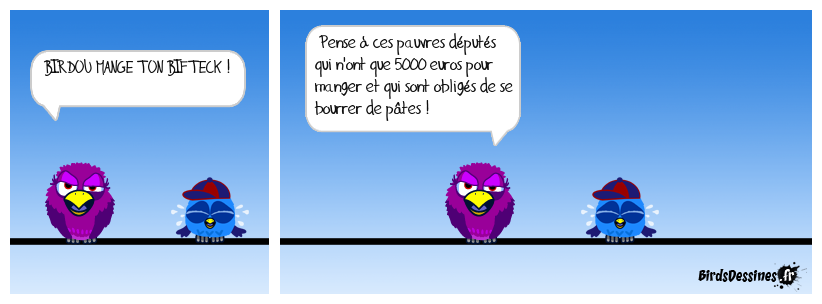 Case 1:Bird 1: BIRDOU MANGE TON BIFTECK ! | Case 2: Bird 1: Pense à ces pauvres députés qui n'ont que 5000 euros pour manger et qui sont obligés de se bourrer de pâtes ! | Case 3:
