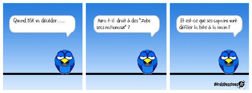 Case 1:Bird 1: Quand DSK va décéder..... | Case 2: Bird 1: Aura-t-il droit à des "zobs secs nationaux" ? | Case 3: Bird 1: Et est-ce que ses copains vont défiler la bite à la main ?
