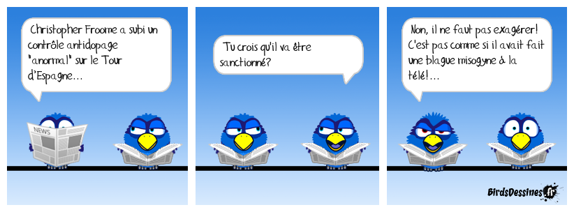 Case 1:Bird 1: Christopher Froome a subi un contrôle antidopage "anormal" sur le Tour d’Espagne... | Case 2: Bird 1: Tu crois qu'il va être sanctionné? | Case 3: Bird 1: Non, il ne faut pas exagérer! C'est pas comme si il avait fait une blague misogyne à la télé!...