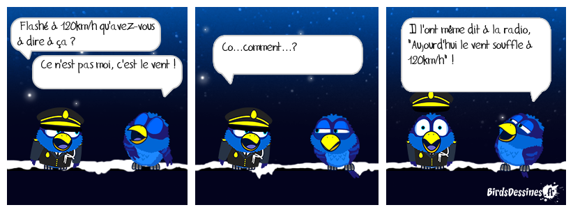 Case 1:Bird 1: Flashé à 120km/h qu'avez-vous à dire à ça ?Bird 2: Ce n'est pas moi, c'est le vent ! | Case 2: Bird 1: Co...comment...? | Case 3: Bird 1: Il l'ont même dit à la radio, "Aujourd'hui le vent souffle à 120km/h" !